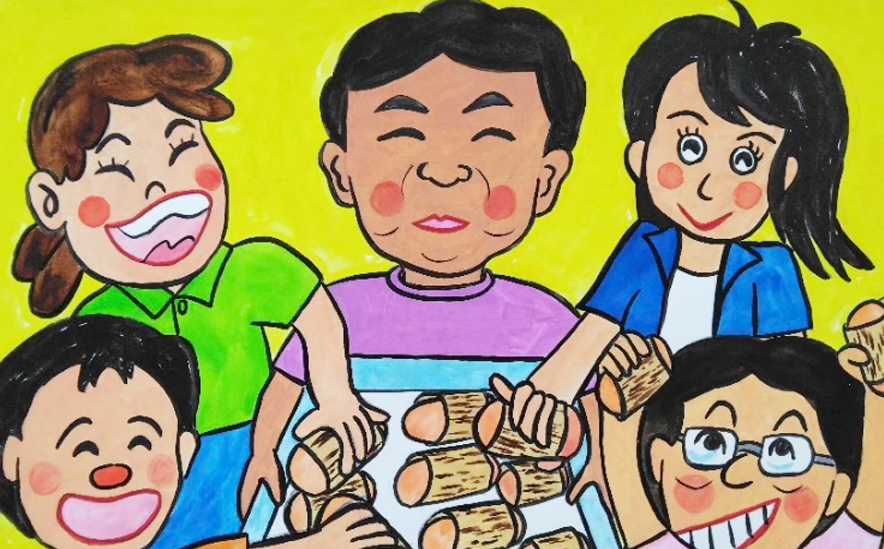 面倒見の良い親分肌のHさんが、家でも地域でも、常に周りの人のために大奮闘していた姿を人生紙芝居の中では描いていきます。腰を曲げての田植えのシーン、乳牛の乳しぼりのシーン、大家族のために大鍋で夕食を作っているシーン、仲間と一緒に農協の研修旅行に出かけるシーン等、認知症が始まっているHさんの記憶に働きかけ、少しでも思い出してくれそうなシーンを選んで絵を描きました。そして、紙芝居の最後には、Hさん特製竹皮まんじゅうが登場。仲間と共にまんじゅうを食べて、皆が笑顔になるという話で終わりになります。