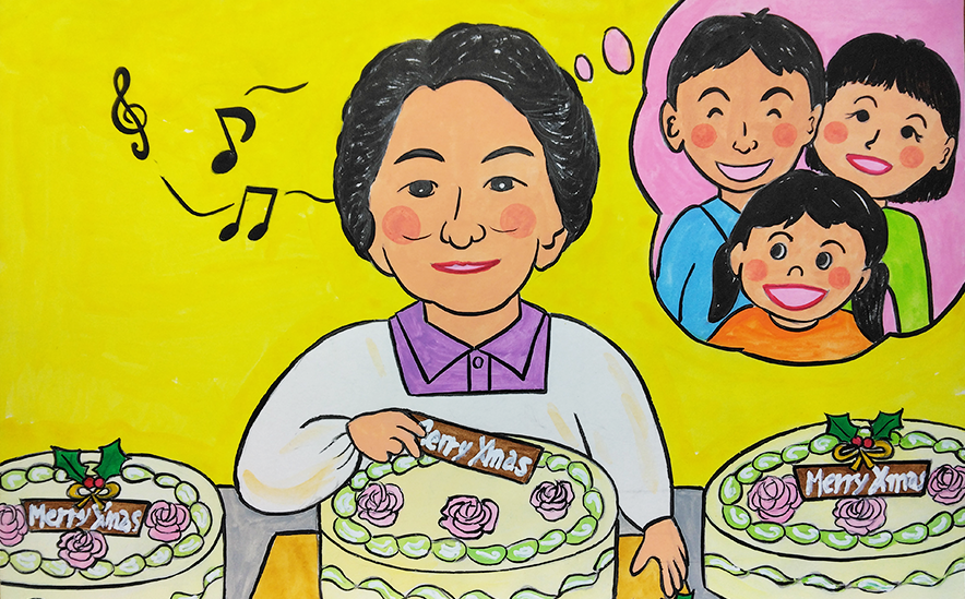 人生紙芝居にも、実に多くの料理が描かれています。例えば、「戦争中の飢えをしのぐ蒸かし芋」、「家族で競争して食べたおやつの蒸かし饅頭」、「おふくろの味とも言えるカツオの潮汁」、「近所の蕎麦屋から出前で頼んだ天丼」、「バタークリームを使った手作りクリスマスケーキ」、「仕事仲間と呑み屋で注文するマグロの握り」、「狩猟で仕留めたイノシシ鍋」等々。主人公の方の思い出とセットになって描かれる一品。『食べることは、生きること』だから、人生紙芝居に数々の食べ物が登場するのは必然です。そして、その絵から、「家族の絆」や「母の愛情」、「仕事への情熱」、「ご近所との温かい繋がり」など、目に見えないものも伝わってきます。